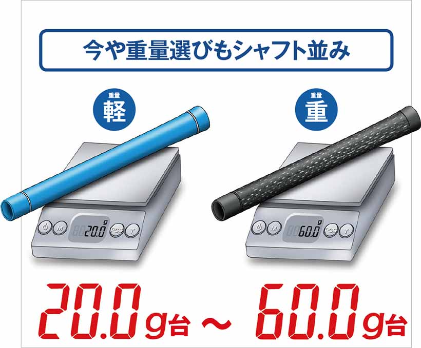 ただし、最近は軽量グリップの開発も進んでおり、20g台のものも作られている。クラブの軽量化、バランスを考えるなら要チェックだ。