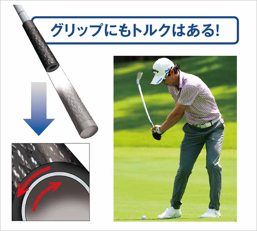 シャフト同様、スイング中にグリップもねじれる。コード入りなどは硬さもあり、トルクが抑えられやすい。樹脂系では素材や構造で計算してトルクを抑えているモデルもある。