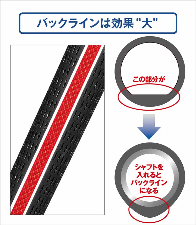 内側の一部を平らにすることで、シャフト装着時に外側に張り出すのが「バックライン(リマインダー)」。最近は『ゴルフプライドアライン』など、強調したモデルも登場。