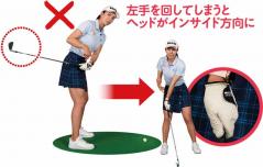 テークバックで左手を回してしまうと、フェースを開きながら、ヘッドがインサイド方向に動いてしまう。トップではシャフトがクロスする動きにつながる。ダウンスイングでは回した左手を戻そうとするので手首が上を向く。手首が上を向くとロフトが寝て飛距離をロスしたり、ダフリの原因になる 。