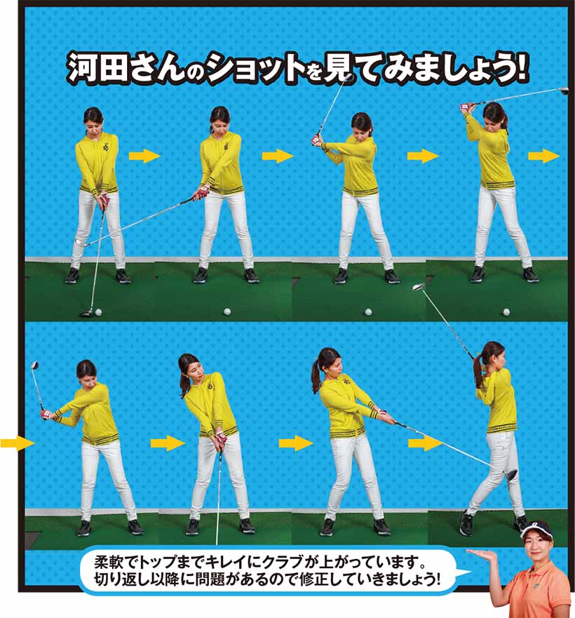 柔軟でトップまでキレイにクラブが上がっています。切り返し以降に問題があるので修正していきましょう!(志賀友香プロ)