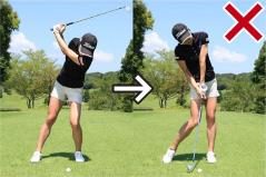 ボールを左目で見ると、上体が左に傾いたアドレスとなりやすいので注意。バックスイングで頭が左に動いて体重が右足に多く乗って、その反動でダウンスイング以降は頭が右に流れてしまいます。上体が右に傾いて右足体重のインパクトとなり、パワーが伝わりません。ミート率も上がらず、様々なミスショットを誘発します。ボールを右目で見る「目線」はアドレスもインパクトも変わりません。これがアドレスとインパクトをそろえて、アイアンショットの飛距離を伸ばすポイントです。