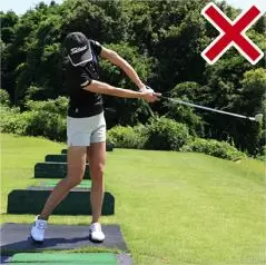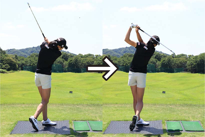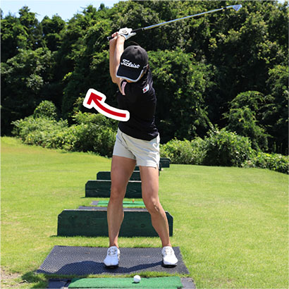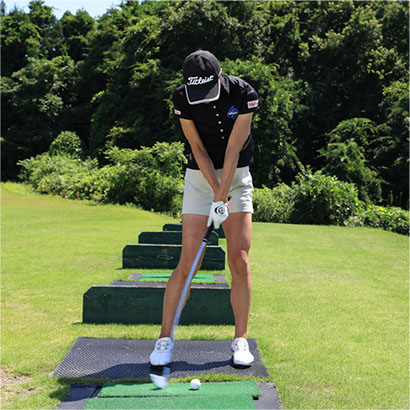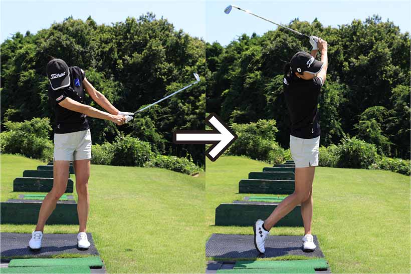 そこでオススメなのが「クロスハンドドリル」。クラブは8〜9番アイアンがいいでしょう。右手と左手を通常と逆にしてグリップすると左手が右手よりも遠くになるため、バックスイングで左肩が引っ張られて、カラダの強い捻転が感じられます。そしてダウンスイングではカラダの早い開きを抑えることができ、カラダの真正面でボールをとらえやすくなります。通常のグリップで持つとインパクトで左ワキが開き、手首が折れてしまいやすい人でもクロスハンドに持てば、インパクトで左ワキが自然と締まってハンドファーストのインパクトが作れます。