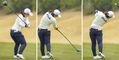 158センチと小柄ながら、高いトップからパンチのあるショットを放つ選手です。ハンドアップ目の構えからコックをあまり使わず体を大きく回してトップへ行き、あとはフィニッシュまで一直線という潔いスイングなのですが、インパクトからフォローにかけての右腕使いは絶品! これだけ気持ちよく叩いても振り負けないのは、ヒジから手首までの腕っぷしの強さがあるから。しっかり手を体の近くに通しながら確実に返せるのは持って生まれた才能でしょう。このパワフルさと緻密さがトータルドライビング1位の所以ですね。