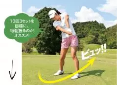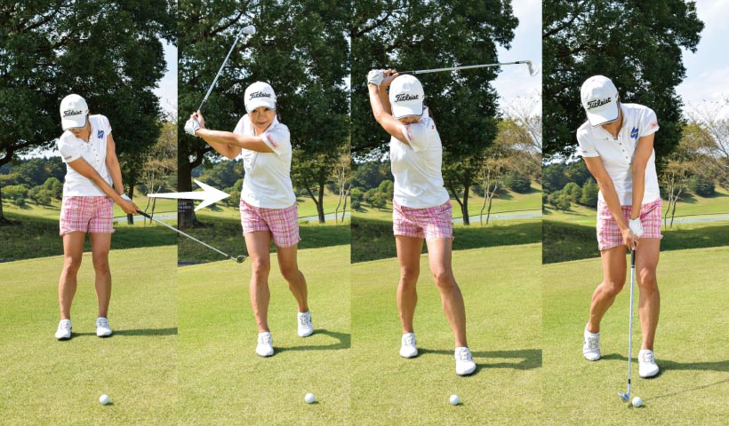 トップはバックスイングの終点であると同時に、インパクトへ向かう切り返しの地点でもあります。トップのポジションやフォームが安定すればダウンスイングの軌道が整いやすく、スイングの再現性や反復性が向上してミート率がアップします。安定したトップを作るには、左手の親指にクラブをしっかり乗せることが大切。左手1本でクラブを持ち、バックスイングして親指にしっかり乗せる練習をしてみましょう。おヘソをしっかり回し、左腕をできるだけ伸ばしたまま上げるのがポイントです。