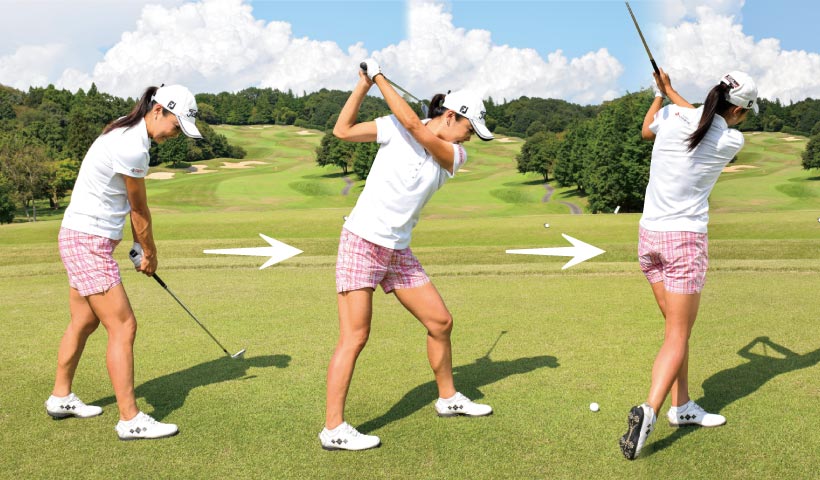 テークバックを始動させるきっかけは人それぞれで、私は手のワッグルを数回繰り返しますが、一番オススメしたいのは、重心を左右交互に乗せて足踏みしてから始動すること。足を実際に浮かせても浮かせなくても構いませんが、重心を交互に乗せると始動のタイミングがとても取りやすくなります。「静から動」は難しいですが、「動から動」でテークバックする方法を取り入れるとスイング全体のリズムや動きがよくなって飛ばしにつながります。