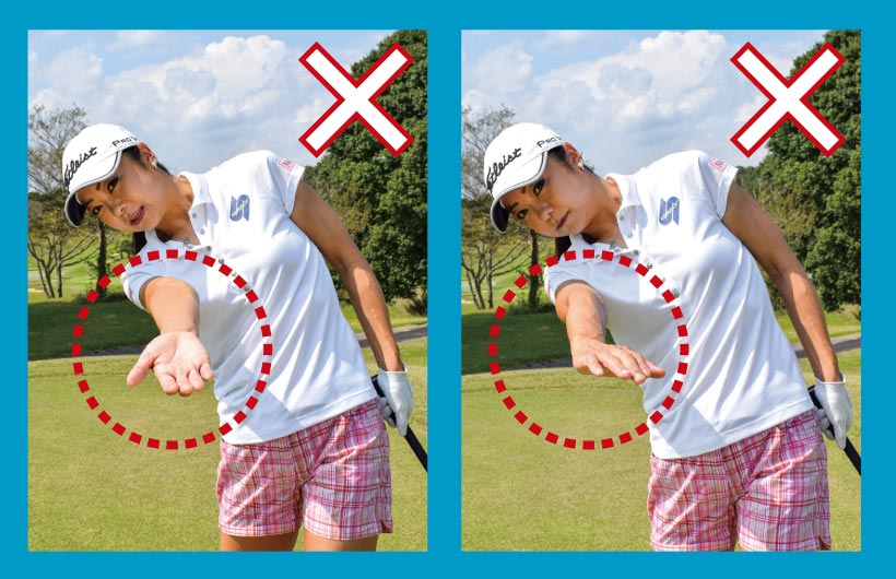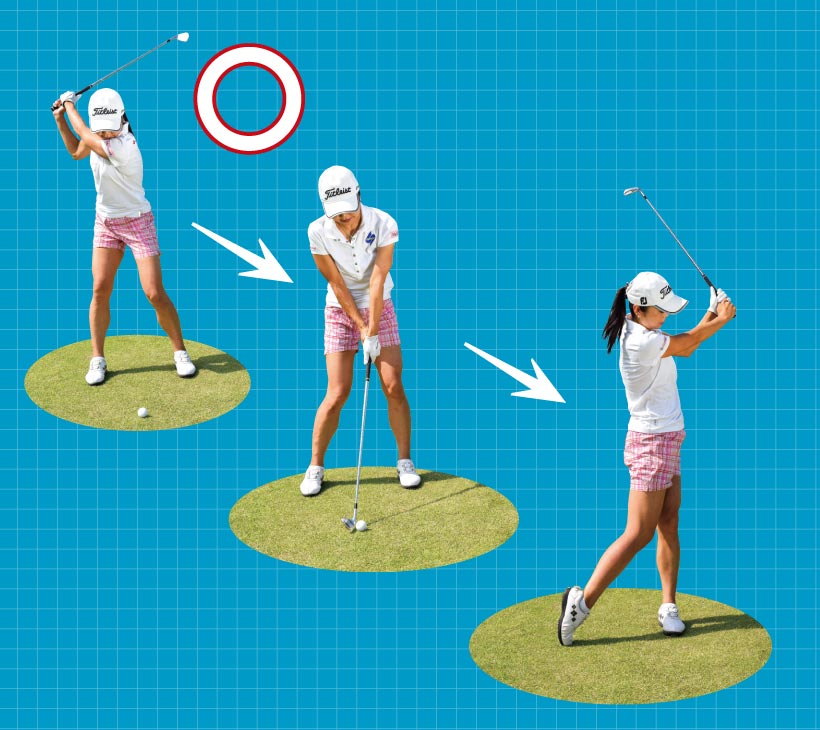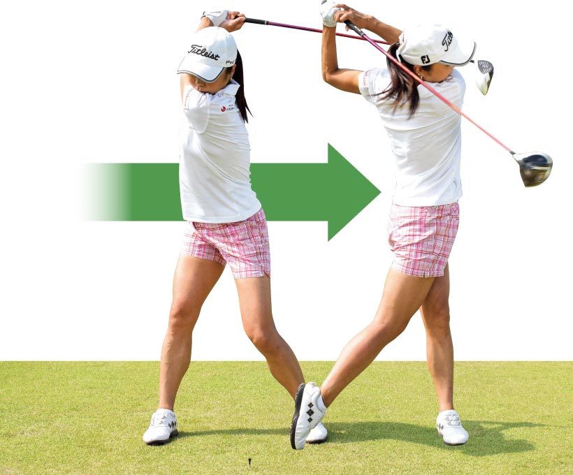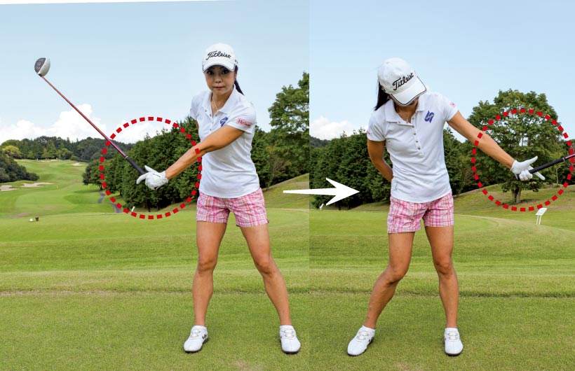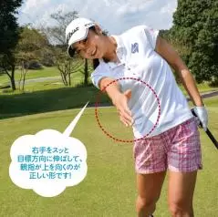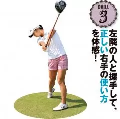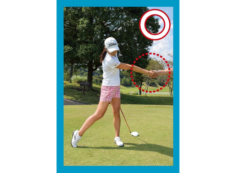 真っすぐ飛ばすには、インパクトからフォロースルーにかけてフェース面をスクエアに保って球を正確にとらえることが不可欠です。そのために意識してほしいのが、左隣の人と握手できるような右手の使い方。