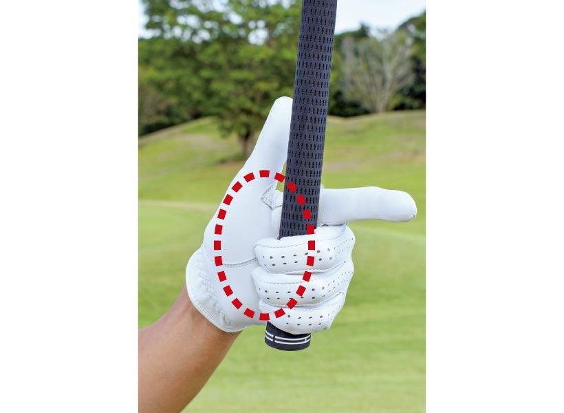 クラブヘッドから一番遠く離れた指は「左手小指」です。つまりスイングの支点となり、この小指をしっかり握ることが正確なショットの基盤となります。それにはまずグリップを1インチほど短く持ち、小指側3本と手のヒラの肉厚の部分で挟むように握るのがポイント。長く持つと小指が緩みやすいので注意が必要です。左手1本で振り、小指支点でクラブを動かす感覚を覚えると、スイング中のクラブコントロールがしやすくなって精度が上がります。