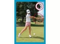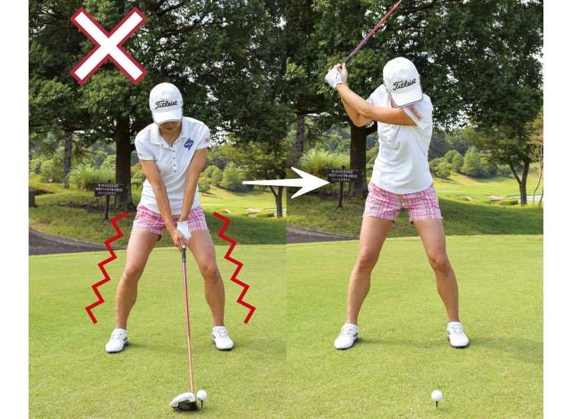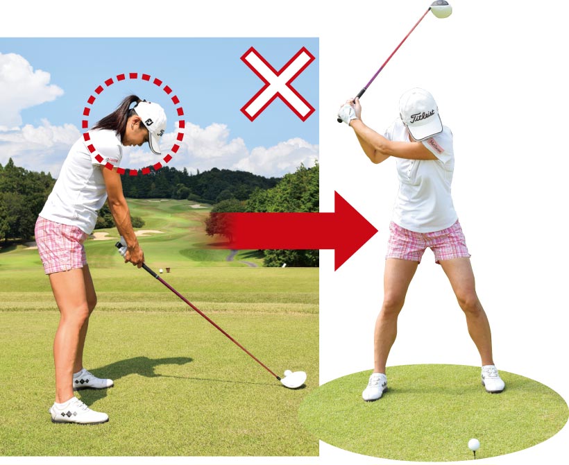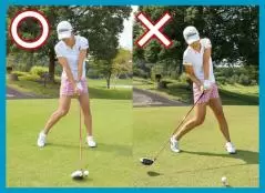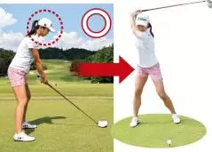 ボールをよく見ようとしてアゴを引いて頭が下がってしまう人がよくいます。しかしこれではアゴが邪魔になってバックスイングで左肩の通り道がなくなり、回転不足でミスを招いてしまいます。そこで、意識的にアゴを上げて構え、ボールを凝視ぜずにやや下目使いでぼんやり見たアドレスから打つ練習を繰り返してみましょう。バックスイングで肩が回転しやすくなることで深い捻転を実現。前傾角度もキープできるのでミート率が数段アップするはずです。