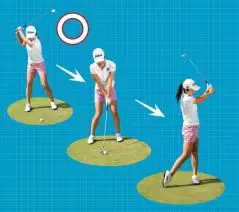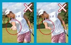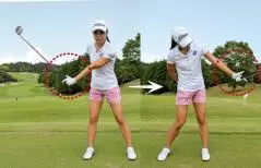 すぐ左側にいる人と、体をクルッと回してお互いに右手で握手。そうすると右手の親指が上を向くはずです。実はこれがフェースの向きをコントロールするコツ。右手のヒラが下を向くとフェースは被り、上を向けば開く。右手を意識するだけでフェースをスクエアに保ちやすくなります。