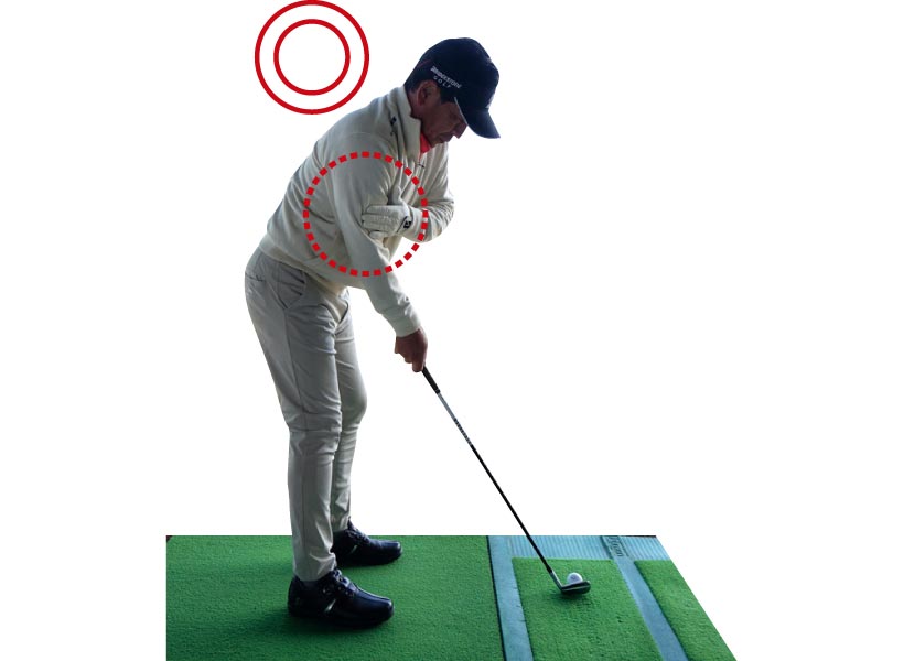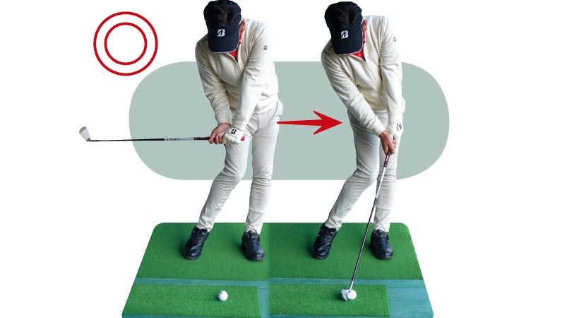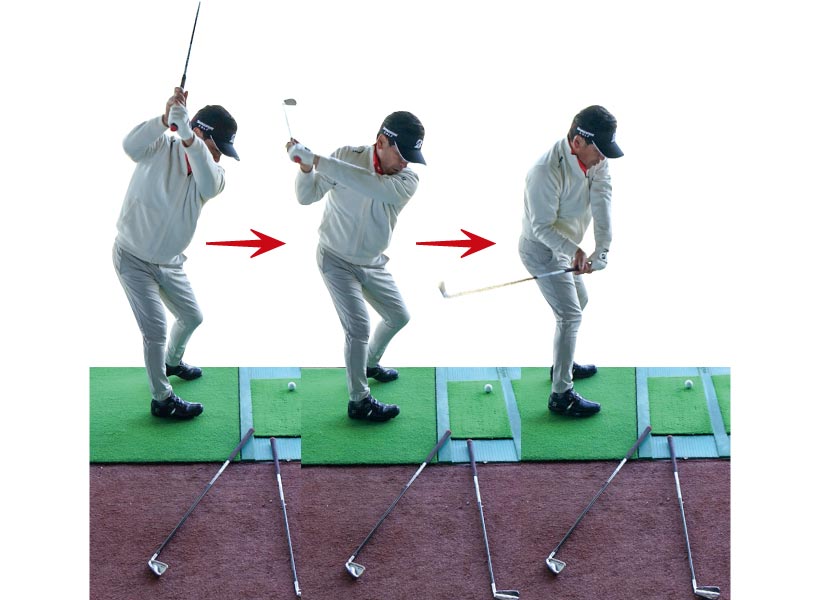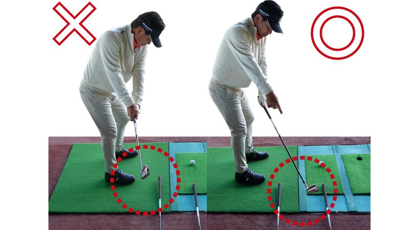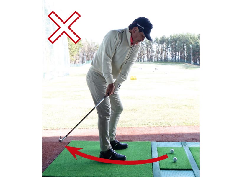 目指すのはアウトに上げてインから下ろすスイングですが、始動でクラブをインサイドに引くべきと勘違いしているケースは多いもの。しかしインに引くとダウンスイングでは逆の動きが生じてアウトから下りてカット打ちに。つまり始動でインに引かないことが最大のポイントで、そのためには、ヘッドの30センチほど後ろに球を置いて、その球を真後ろにコロがす練習が有効です。安定して真後ろにコロがっていれば、始動でヘッドが真っすぐ動いている証拠。第一ステップクリアです!