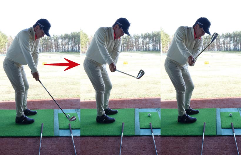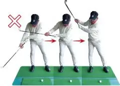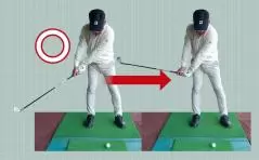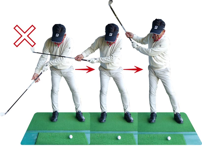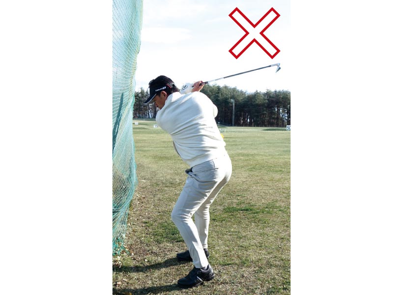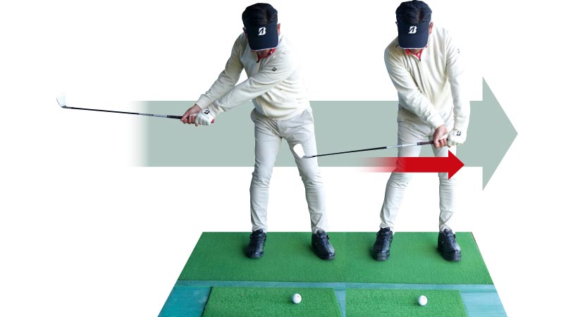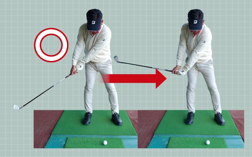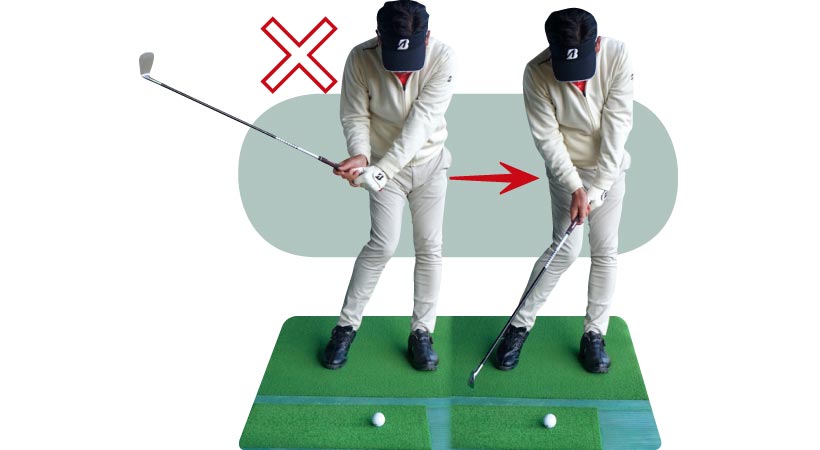 インに引き込んでいたスイングとはまるで違いますが、この動きこそが理想のバックスイング。定着するまで繰り返しましょう。