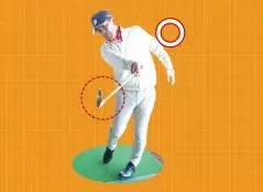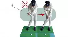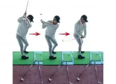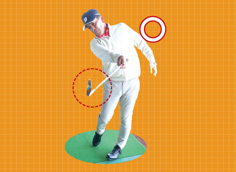 両手を離してグリップの両端を握り、その状態でバックスイングして、右足を超えたら右手を固定したまま左手のヒラでグリップエンドを押し下げます。すると手の位置はそのままなのに簡単にヘッドが上がることがわかるはず。あとはこの手首の角度を保って体の回転で上げればOK。手が暴れることなく毎回同じルートを通るので、クラブの動きを制御しやすくなり目指すスイングに近づきます。