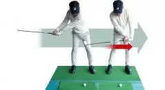 シャロースイングを完成させるには、手元を低く保ってヒットするのがポイント。それには手元を左足前まで動かすことが不可欠です。クラブを地面と平行な状態にしたら、左手はグリップエンド側、右手はグリップの右端を握り鐘をつくイメージで左右動かします。手元がしっかり動けばインサイドの低い位置から球へ向かう理想のインパクト軌道が生まれ、シャローなインパクトが手に入ります。