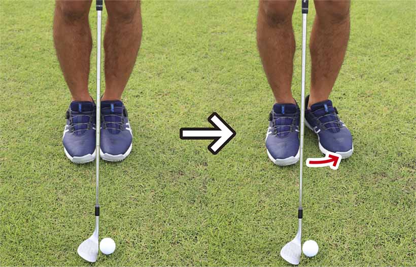 これが基本です。そしてランニングアプローチなら右足寄りにセット、ピッチ&ランなら体の中心にボールをセットすればいいのです。