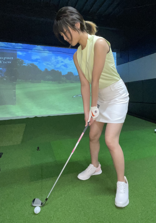 - 左に体重をかけて、ハンドファーストにアドレス