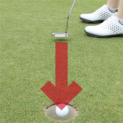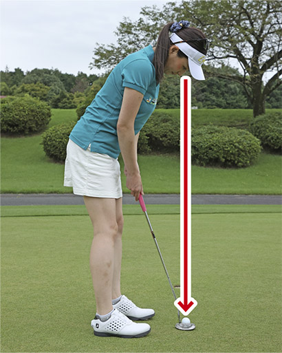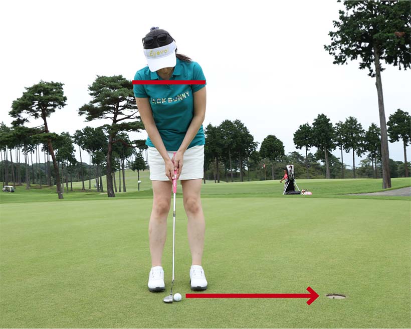 カップインしやすければどんな構えでもいいとか、「パットに型なし」という考え方もありますが、カラダの向きはラインと平行にセットした方がラインに対してパターをストレートに振りやすく、カップインの確率アップに直結します。カップまでが近いため、顔がカップの方を向いて両目がラインとクロスしたアドレスになりやすい点にも注意。両目がラインとクロスするとストロークの軌道がズレやすく、カップを外してしまいがち。両目をラインの真上に重ねるように構えて、ストローク中も両目の位置が変わらないようにしましょう。