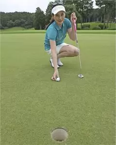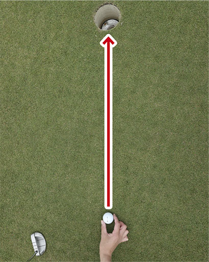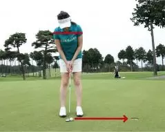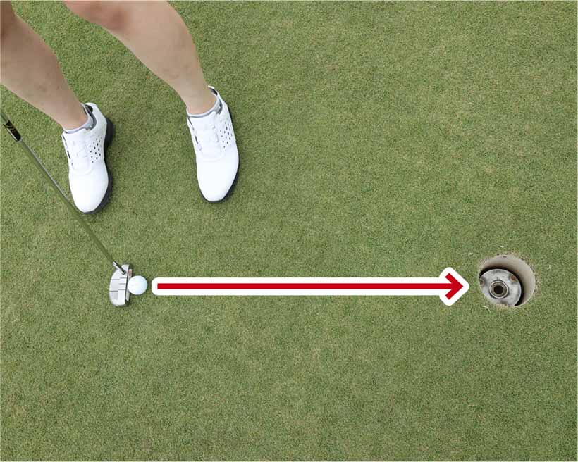 ショートパットは方向性が命ですから、アドレスでもっとも肝要なのはフェースの向き。肩やスタンスなどカラダの向きがスクエアでも、フェースの向きがずれているとカップを外しやすくなります。フェースの向きがスクエアなら、カラダの向きの多少の誤差は許されるといってもいいくらいです。カップまで1メートルくらいなら、余程の傾斜でない限りはフェースの面をカップに真っすぐ向けて、ストレートに狙っていきましょう。
