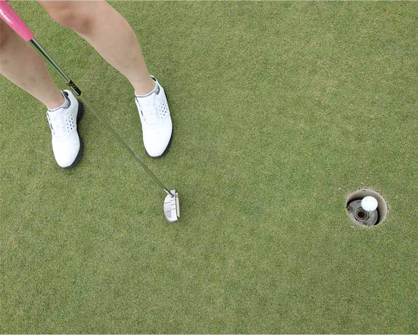 1メートルの短いパットを確実に入れたいけど、外してしまうことが多い。ショートパットのミスから3パットや4パットを繰り返してしまう。ゴルファーの皆さんのこうした悩みをよく耳にします。10メートルくらいのロングパットではカップインの確率が極めて低いですから、カップの近くに寄せることが第一です。でも1メートルのショートパットは100パーセントに近い確率で入れたいもの。そのためにはアドレスでスクエアに構えることがとても大切です。