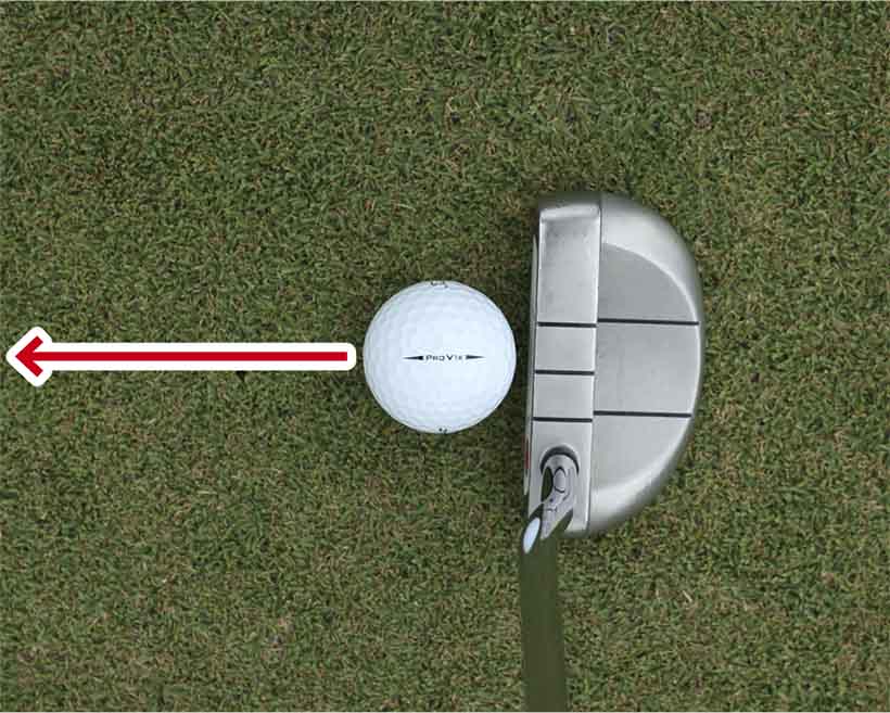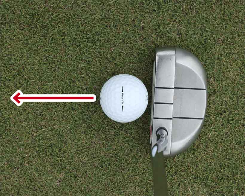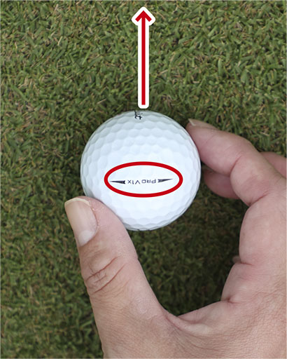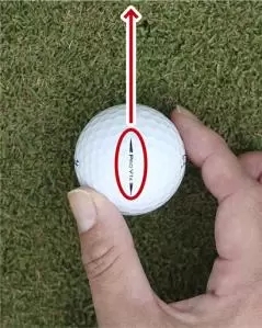 フェースをカップに真っすぐ向けることの重要性は理解しても、フェースを正しくセットする感覚がよくわからないという人は、ボールの線を利用するのがオススメです。最近のボールの多くは細長い線状のブランドネームを2つの細長い▲▼が挟んでいて、細長い▲▼を矢印代わりに使えるようになっています。また自分でボールにマジックで線を書き入れている人も多くいます。
