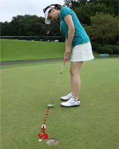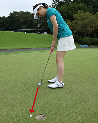 グリーンには傾斜がありますが、カップまで1メートルの距離ならカップに向かって真っすぐ打ち出すのが基本です。カップを30センチオーバーさせるくらいのやや強めのタッチで打てば、曲がる前にカップインしやすいといえます。でも2メートルくらいになると、多少はラインを読むことも必要です。ボールからカップまでの傾斜を見て、「ちょっと曲がるな」と判断したら、仮想の目標を設定してその場所に向かってフェースを真っすぐセットし、真っすぐ打ち出しましょう。1カップぶん左に曲がるラインなら、1カップ右を狙ってストレートラインのつもりで打てばOKです。