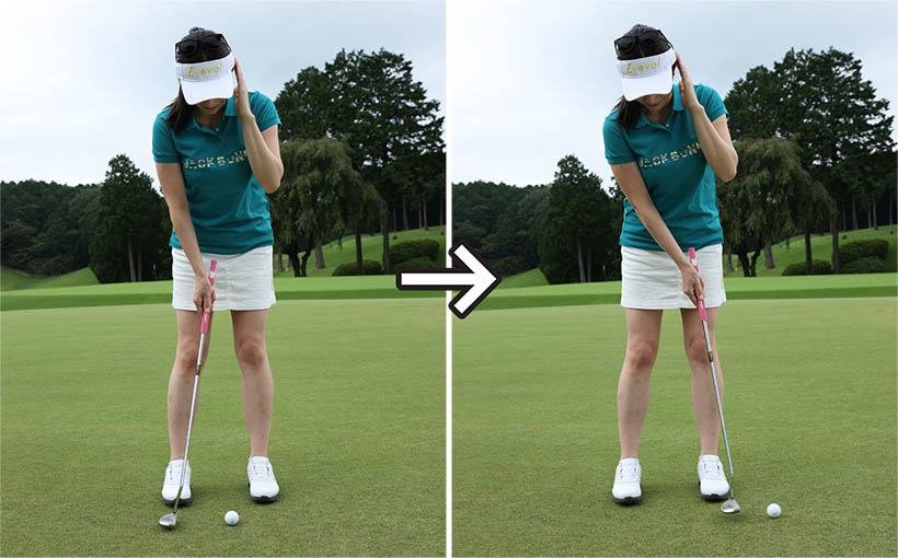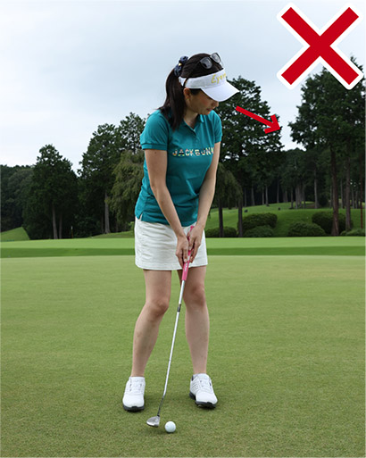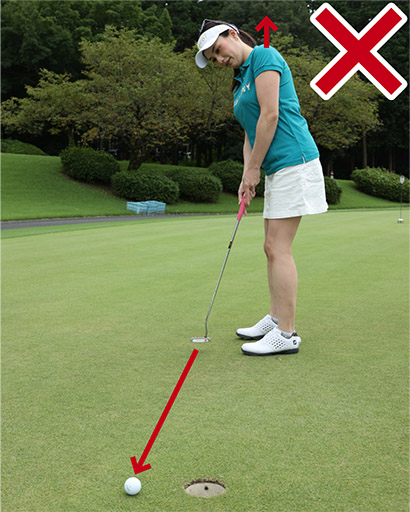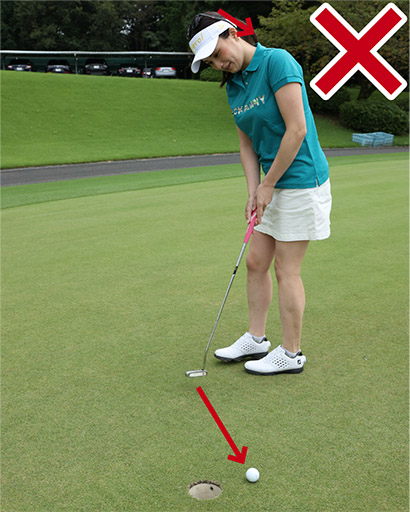 ストレートラインでも曲がるラインでも、カップの左に外しやすいタイプと右に外しやすいタイプがいて、それぞれの傾向やクセがはっきりと表れます。左に外しやすい人はインパクトで上体が突っ込むため、フェースがかぶって当たりやすいのが原因。カップの右に外してしまうことが多い人は、カップに向かってフェースを真っすぐ出そうとしすぎてインパクトで上体が起き上がり、フェースが開いて右に押し出すように当たっているためです。狙ったターゲットに向かってボールを真っすぐコロがすつもりでストロークすれば、こうしたミスが減ってくるはずです。