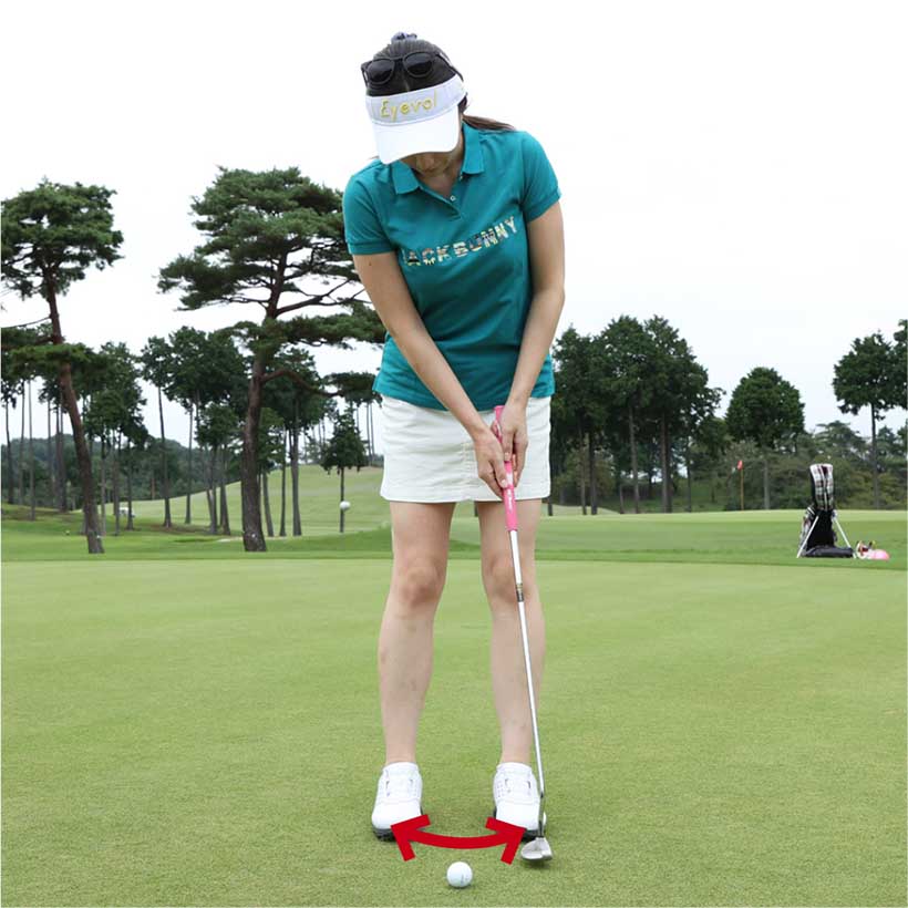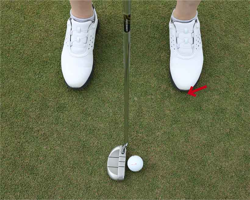 構えたときの目線や顔の向きを変えないでストロークし、上体の突っ込みを防ぐには左サイドの壁を作る意識を持つのもいいと思います。そのためにも通常は両足のツマ先を軽く開いて構える人でしたら、左ツマ先を真っすぐ向けておくのがオススメ。こうするとストローク中にカラダの軸を固定しやすく、上体が突っ込まなくなります。あとは振り子運動のイメージで、一定のリズムとテンポでストロークすることと、右手首や左手首の角度が変わらないようにパターを振ることを心がけましょう。とくにショートパットはインパクトが緩んだり、パンチが入ったりしてストロークとリズムが変わりやすいので注意が必要です。小さい動きでも打つ前に連続素振りをして、振り子運動の感覚を思い出してからストロークすればカップインの確率がかなり上がりますよ。
