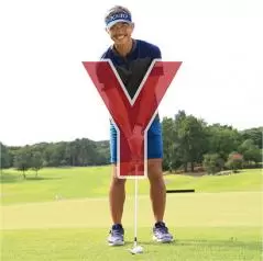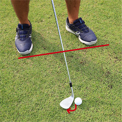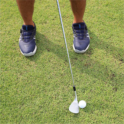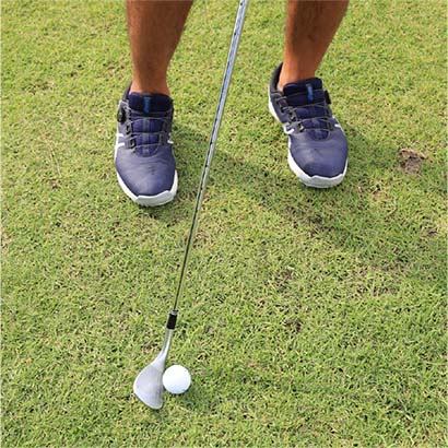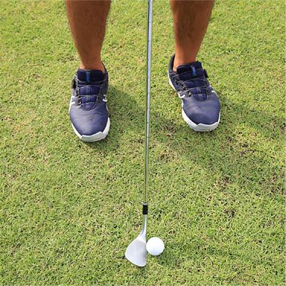 ボールを上げてコロがすピッチエンドランは狭めのスタンスで立ち、ボールをスタンスの中央、つまりカラダの中心線上にセットします。アドレスの姿勢を真正面から見ると両腕とクラブが大文字のY字となるように構えます。これでサンドウェッジのロフト角どおりに構えることができます。