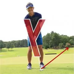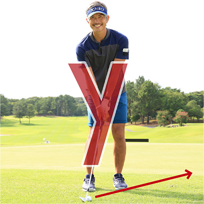 ボールを低くコロがしてキャリーよりもランを多く出したいランニングアプローチは、ボールを右足のツマ先の前にセットするだけで、スイング自体はピッチエンドランとほぼ一緒です。ボールを右寄りに置くと両腕とクラブが小文字のy字の構えとなり、フェースが立ってきます。ロフト角が58度とすれば50度くらいとなり、ボールの打ち出し角が低くなるのです。