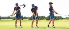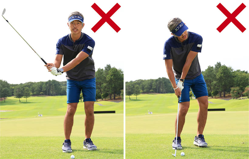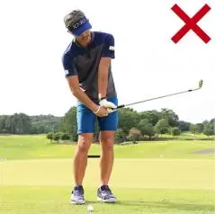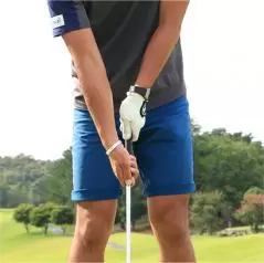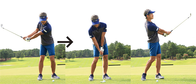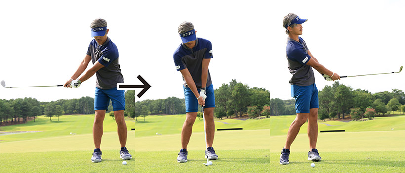 キャリーが少なめとなるぶん、小さいスイングで打ちますが、構えたときのグリップエンドとお腹の間隔をキープし、お腹の回転主体でスイングすることが大切です。テークバックが必要以上に大きくなりすぎたり、インパクトで手首をコネたりするのはNGです。