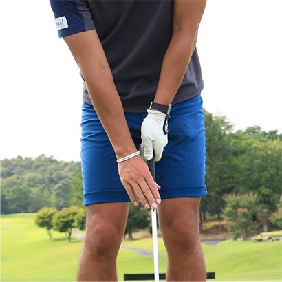 ・構えたときのグリップエンドとお腹の間隔をキープし、お腹の回転主体でスイングすることが大原則。