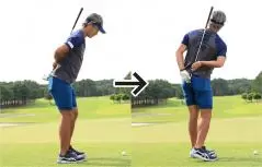 ピッチエンドランの練習ドリルは、両手を5〜10センチほど離してクラブを持つスプリットハンドドリルが効果的です。左手をお腹の前にセットし、お腹を左右に回転させることで正しい動きが体感できます。アドレス時のグリップエンドとお腹の間隔が変わらないようにスイングするコツや、手首の角度をキープして腕や手首の無駄な動きを封じ込む感覚がつかめます。