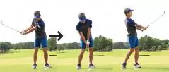 スイングに関しては腕や手を使わず、お腹の回転主体でクラブを振ることが最も重要なポイント。アドレスの両腕とクラブのY字の形が変わらないようにお腹を左右に回すだけですから、自分でクラブを振るというよりもお腹の回転でクラブが振られるといった感覚です。スイング中に頭が上下左右に動かないように、構えたときの前傾軸をしっかりキープしてスイング軌道の安定を目指しましょう。