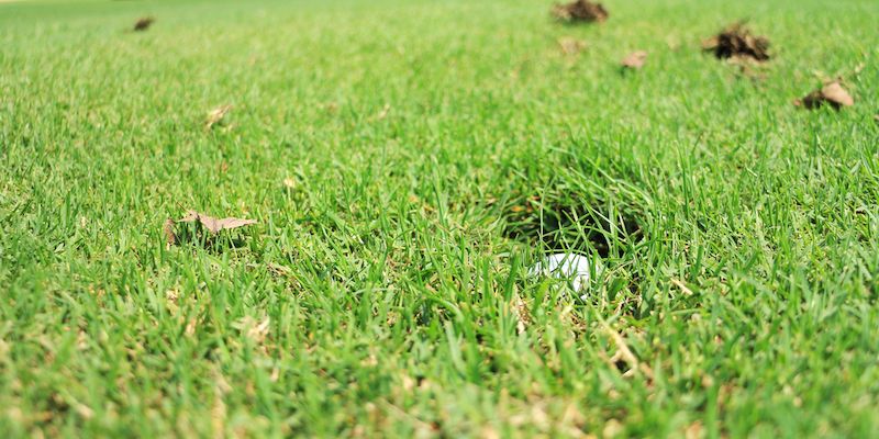 凹みの中にあるボールで、ボールの一部が地表面より下にある「地面に食い込んでいる」状態のときは、(6インチでなく)1クラブレングスの救済が無駄罰で受けられるので覚えておきましょう。