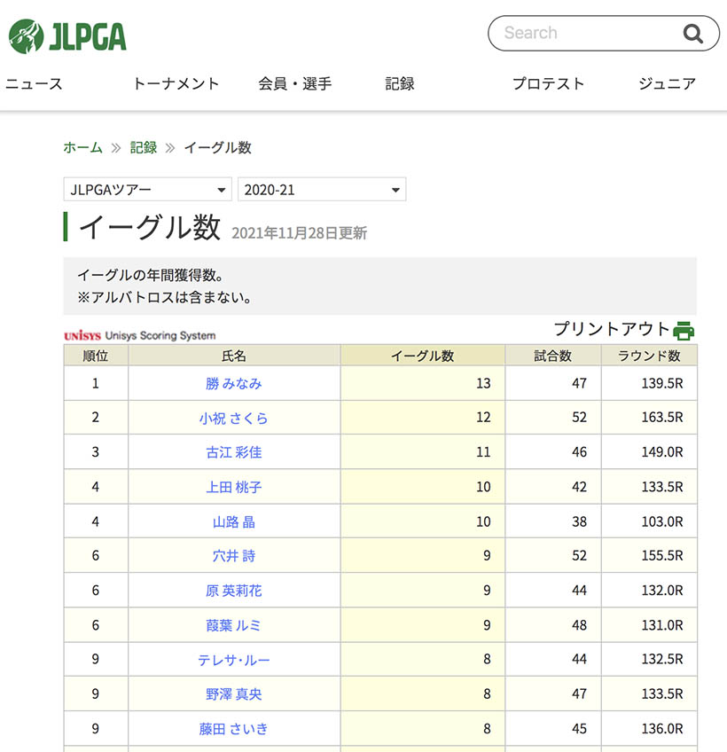 バーディ数では小祝さくらが577個の歴代最多記録を樹立。そして今回のテーマであるイーグル数では勝みなみが13個で新記録をつくったのだ。