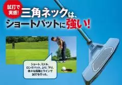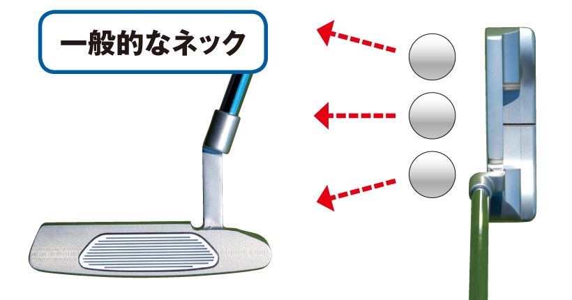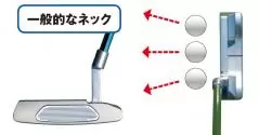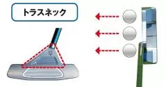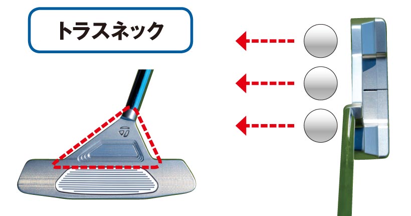 トラスネックのメリットは、三角形のネックの形状で、ミスヒットに強くなる点にあります。トゥやヒールに打点がずれると、ヘッドがネジれて、押し出しや、ヒッカケが出やすくなりますが、このネジれを抑えてくれるので特にショートパットのミスが減ります。