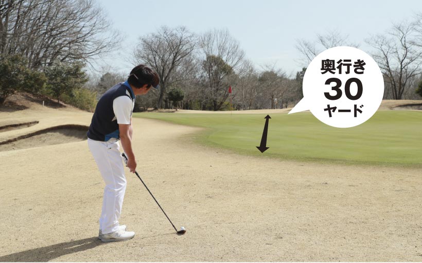 ラウンド中は、コースのロケーションや結果への不安から、微妙な力感を安定して出すのは難しくなります。このようにシンプルに打ち方と打てる距離を決めておけば、プレーの安心につながるのです。グリーンの縦幅は平均すると30ヤード程度あります。つまり、ピンが真ん中であれば15ヤードの誤差があってもグリーンオンは可能なのです。そのくらいの気持ちで、ピン近辺を大まかに狙うほうがプレッシャーに強くなります。