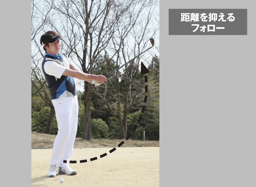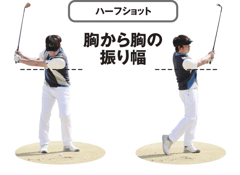 100ヤード以内の中途半端な距離は、ピッタリの距離を打とうとすると簡単ではありません。まずフルショットで100ヤード打てる番手を持ちましょう。その下の番手でフルショットすれば、少し短い距離を打つことができます。さらに、それぞれの番手で、ハーフショットやスリークウォーターなど決まった振り幅でショットします。そうすれば、「番手」×「振り幅」で多くの距離を打ち分けることができます。