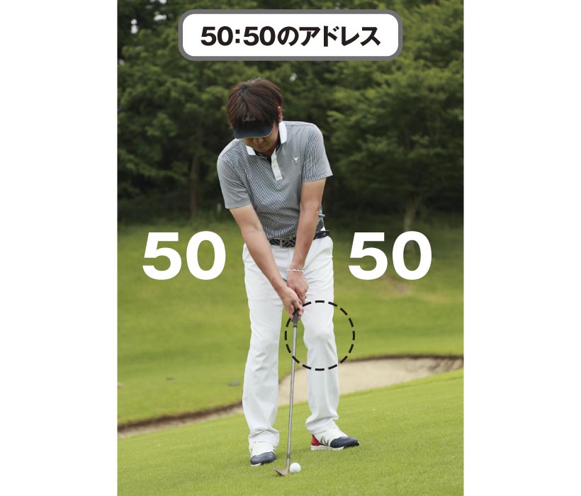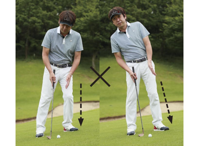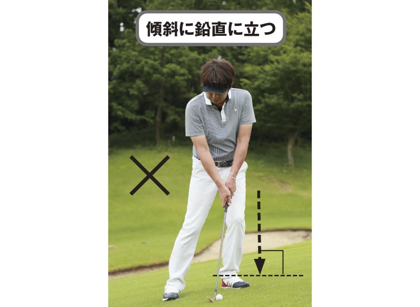 傾斜地でのアプローチでは、このバランスセンサーを活用します。傾斜に立っただけで、人間は自然にバランスを取るので、安定して立てているはずです。その体重配分のまま打つのが、傾斜地のアプローチで重要なポイントになります。よくあるセオリーでは、傾斜に沿って構える方法と傾斜に鉛直に立つ方法がありますが、強い傾斜になるほど、ミスが出やすくなります。