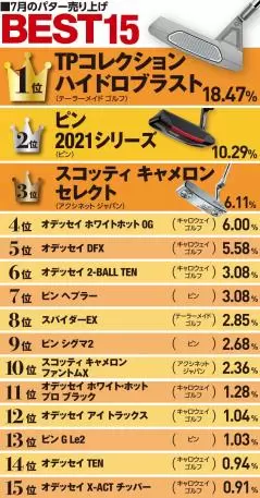 モデル別シェアで約18%の圧倒的な数字でトップになったのは、6月に発売されたテーラーメイドの『TPコレクションハイドロブラスト』。これは今季の女子ツアーで多くのトップ選手が使って大活躍。特に今シーズン7勝、さらに東京オリンピックでも銀メダルを獲得した稲見萌寧が前シリーズのトラス形状を使ったことでも話題になった。『TPコレクションハイドロブラスト』シリーズでも、特に人気なのが、そのトラス形状。7月の売り上げトップ3は1位が『バンドンTM2トラスセンター』、2位が『ジュノTB2トラスセンター』、3位が『バンドンTM1ツアートラスヒール』とすべてトラス形状。発売直後の6月は稲見萌寧が使用する形状に近い『ジュノTB1ツアートラスヒール』がダントツの1位だったが、予想を超える売上げによって欠品が出ているようだ。