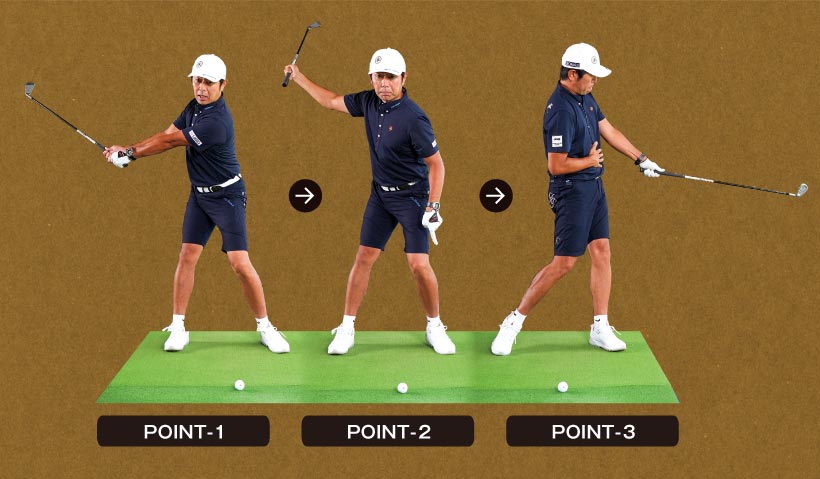 POINT-1 トップの位置は右胸の高さくらいのイメージがいい。バックスイング中、腕はなるべく曲げないことだ。