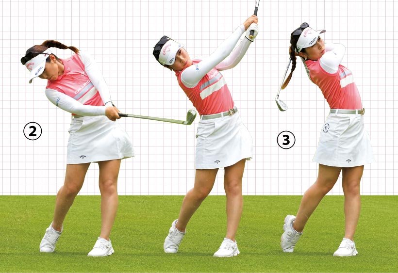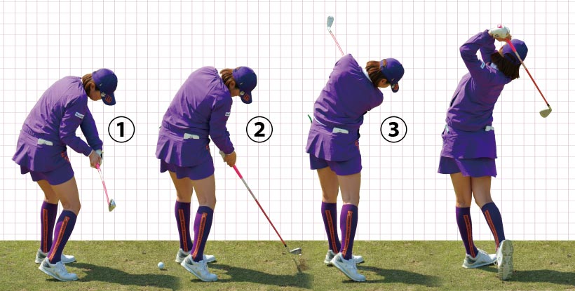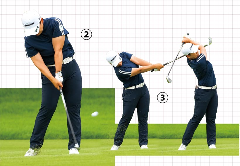 ①カラダの左サイドをしっかり回転してインパクト