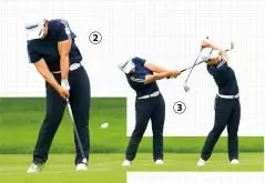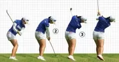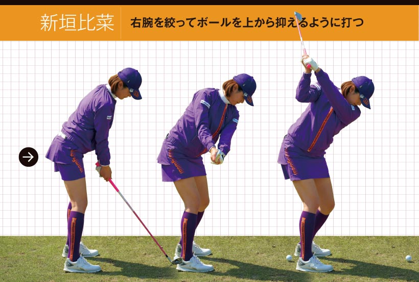②ボールを上からとらえ、インパクト後もフェースをほとんど返さない