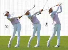 これはウェッジのショットですが、スピンをかけて止めたいという意図が見えます。あまり左手リードでスイングせずに、インパクトでしっかりリリースして右手が左を追い越すように振り抜いています。こうすれば下からあおるように打たなくても球が止まりやすくなります。