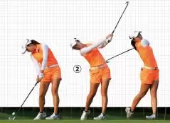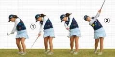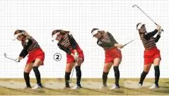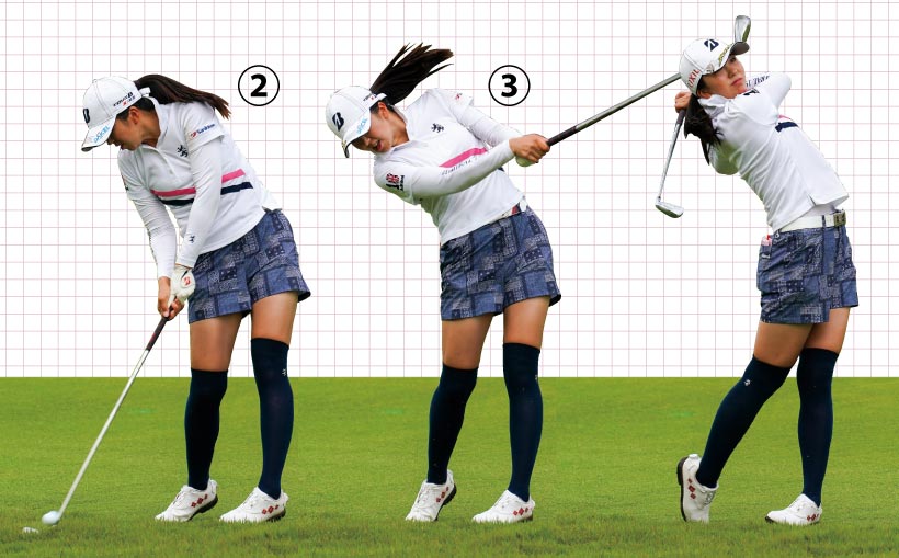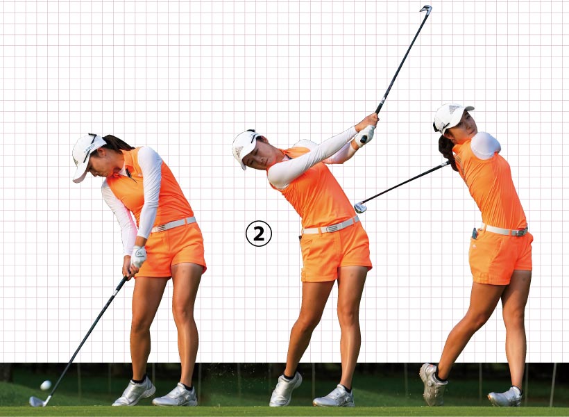 ②左ヒザを伸ばさないでインパクト。いい意味での手打ち感覚だ