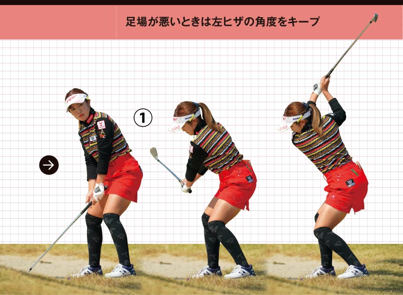 ①フェアウェイバンカーでは左ヒザを曲げて下半身を安定