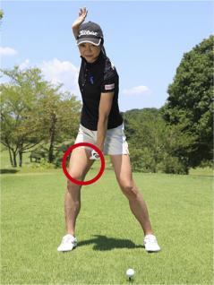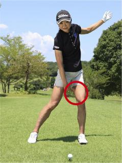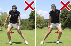 アドレスの下半身はだれかにカラダをどの方向から押されてもビクともしない安定感を保ちつつ、上体の回転運動を妨げないような柔軟性を出しておきましょう。スイング中ももちろん下半身の安定感をキープしなくてはなりません。そのためにはアドレスで感じておいた両モモと両ヒザの張りを意識すること。バックスイングで右ヒザが右側に流れると、体重が右足の外側に乗って下半身のパワーが逃げてしまいます。インパクト以降でも左ヒザが左側に流れてしまうのはNGです。