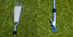 『T100・Sアイアン』の顔は『T100アイアン』とまったく同じに見えますね。両方を並べてみるとようやくロフトが立っているのがわかるくらいです。ヘッドが小さくてトップブレードが薄くてシャープ、オフセットも少なくかまえた感じはタイトリストのプロモデル『620MB』や『620CB』など近く、持っただけでその気にさせてくれる面構えです。ソール幅もけっこう狭く抜けがいいのも特徴です。形状もよく考えられていて、どこか一箇所が地面に突っかかるようなことがなくバンス全体がきれいに当たる感じです。けっこう上から入れてもスパッときれいに抜けてくれて、フェース面のブレもありません。それなりに技術のある人が使えば何度打っても同じような球が出ます。