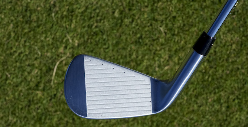 『T100・Sアイアン』の顔は『T100アイアン』とまったく同じに見えますね。両方を並べてみるとようやくロフトが立っているのがわかるくらいです。ヘッドが小さくてトップブレードが薄くてシャープ、オフセットも少なくかまえた感じはタイトリストのプロモデル『620MB』や『620CB』など近く、持っただけでその気にさせてくれる面構えです。ソール幅もけっこう狭く抜けがいいのも特徴です。形状もよく考えられていて、どこか一箇所が地面に突っかかるようなことがなくバンス全体がきれいに当たる感じです。けっこう上から入れてもスパッときれいに抜けてくれて、フェース面のブレもありません。それなりに技術のある人が使えば何度打っても同じような球が出ます。