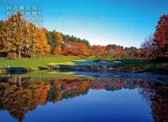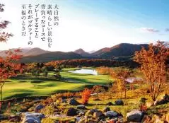 緑一色のコースも鮮明で清々しいが、どこか哀愁のこもった眩しい黄金色に染まった枯葉の透明感や、山ぎわを紅く染める一葉の存在感が、一打を放つ白球の放物線を際立たせてくれる。